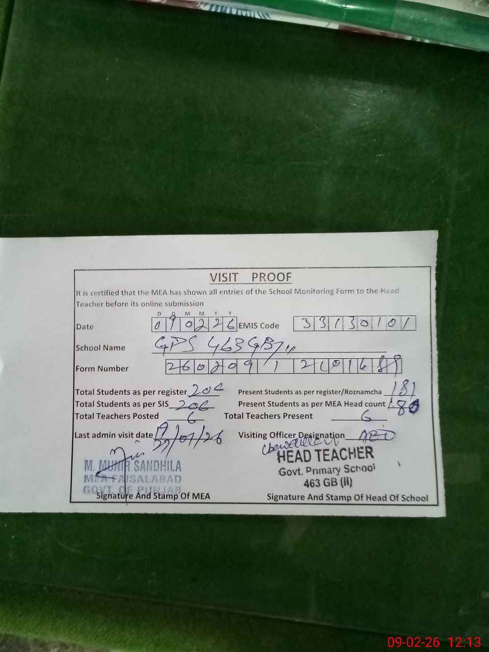 | Attendance Register | Head Teacher | MEA with School | Visit Proof |