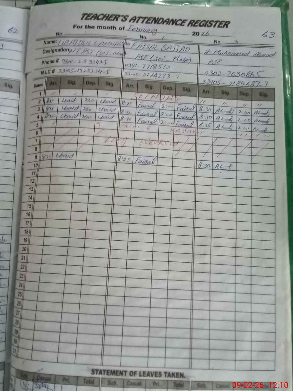 | CNIC | Full Name | Designation | R/C | Absence During Last Calender Month |