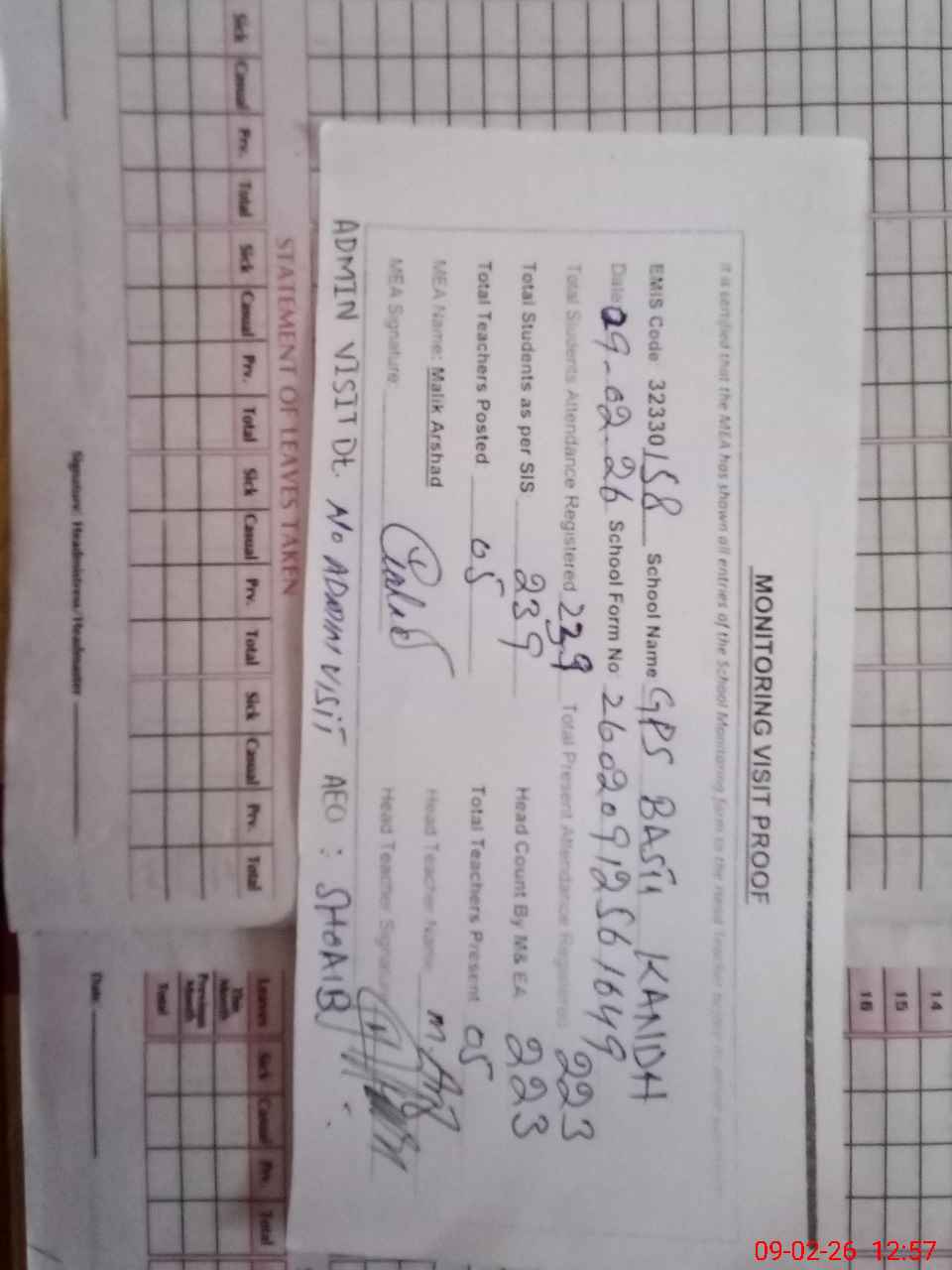 | Attendance Register | Head Teacher | MEA with School | Visit Proof |