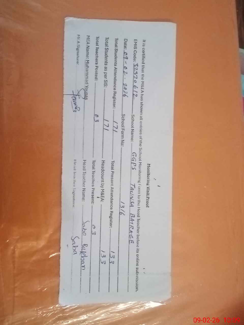 | Attendance Register | Head Teacher | MEA with School | Visit Proof |