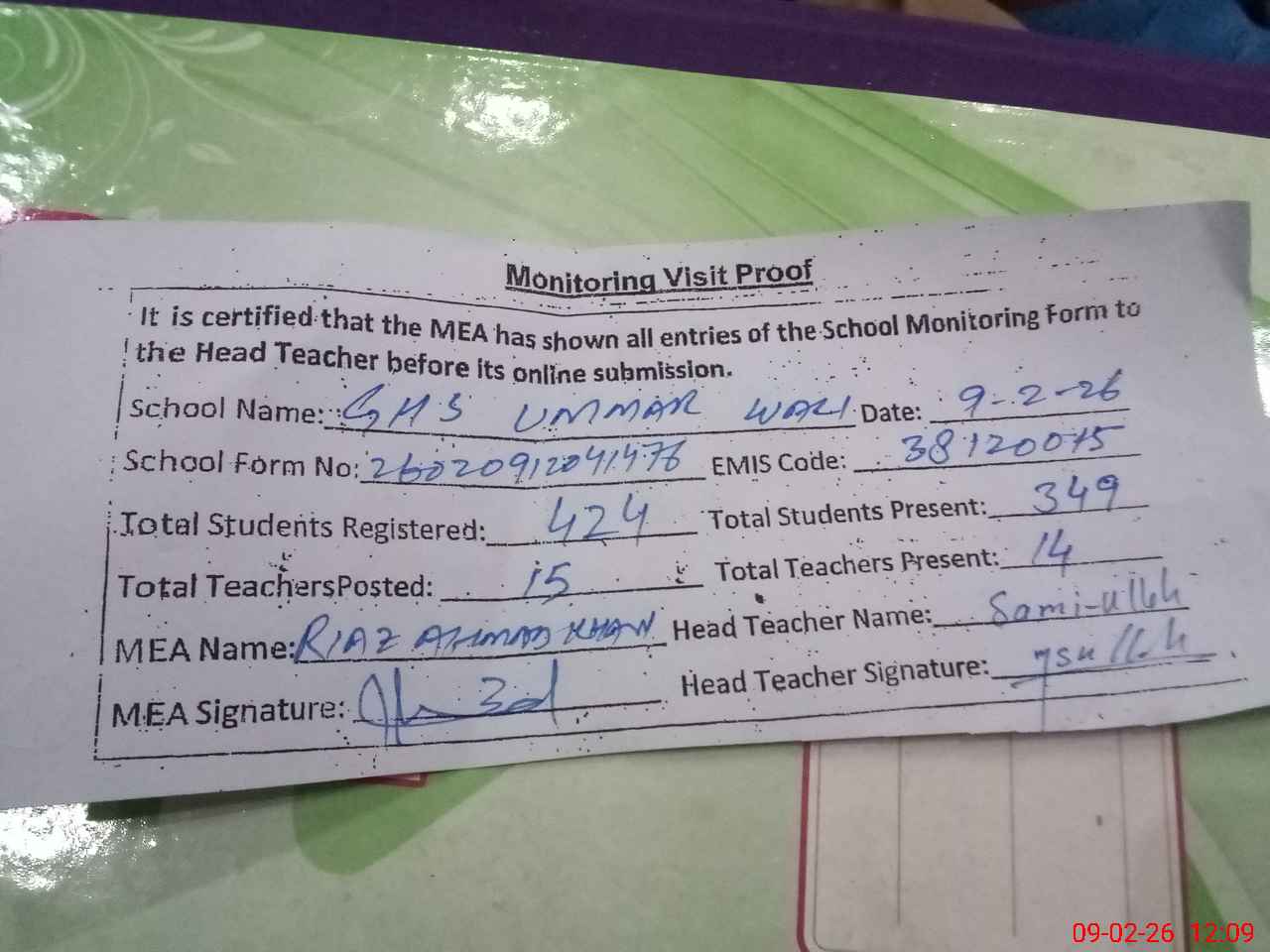 | Attendance Register | Head Teacher | MEA with School | Visit Proof |