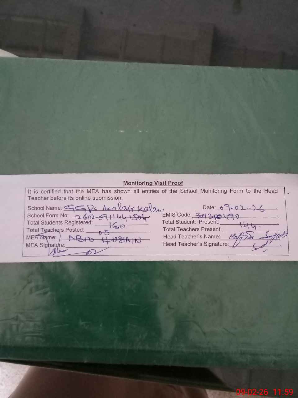 | Attendance Register | Head Teacher | MEA with School | Visit Proof |