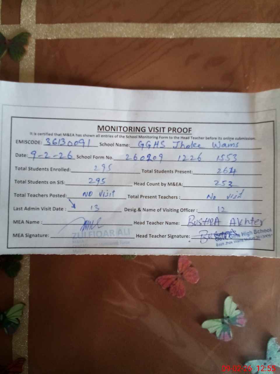 | Certified that this School was Inspected by the Undersigned MEA/DMO Today and the Information Stated Above is as Per Record. | |||||