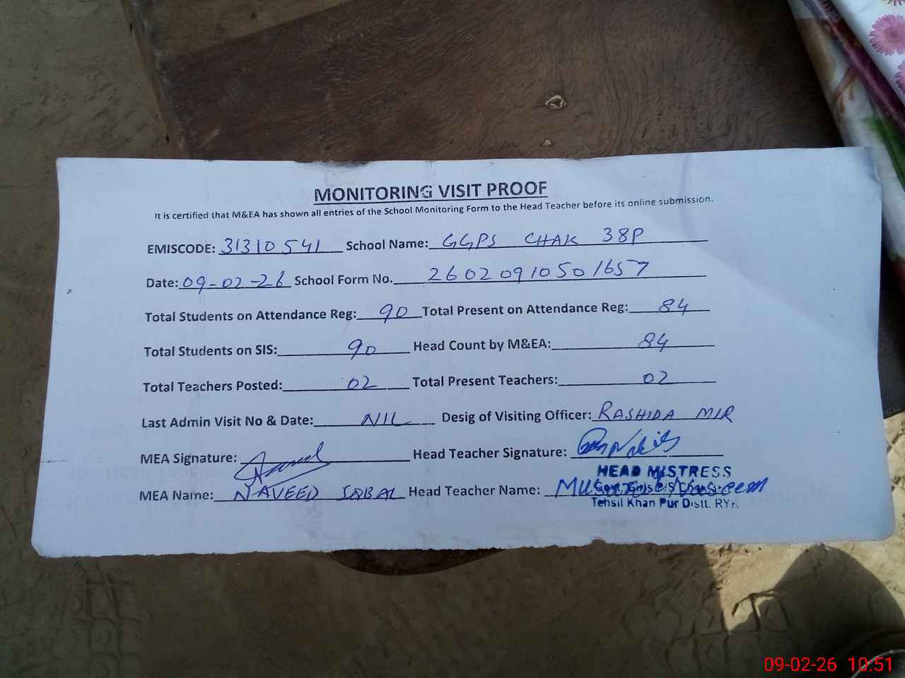 | Attendance Register | Head Teacher | MEA with School | Visit Proof |