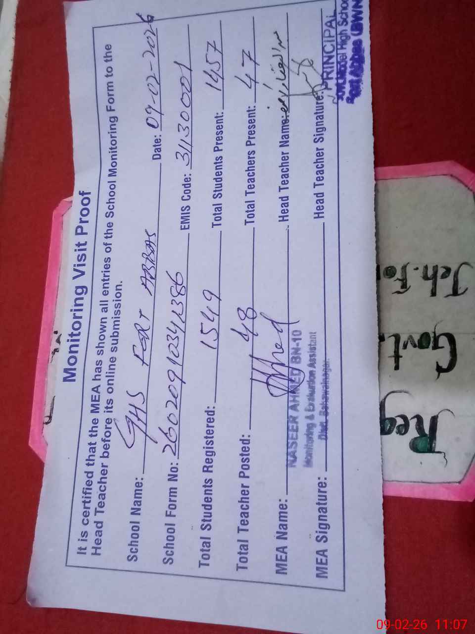 | Certified that this School was Inspected by the Undersigned MEA/DMO Today and the Information Stated Above is as Per Record. | |||||