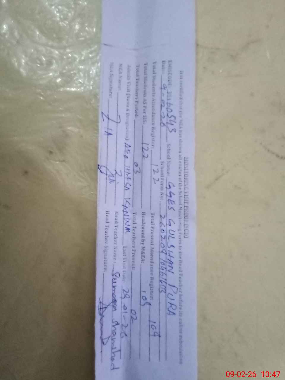 | Attendance Register | Head Teacher | MEA with School | Visit Proof |