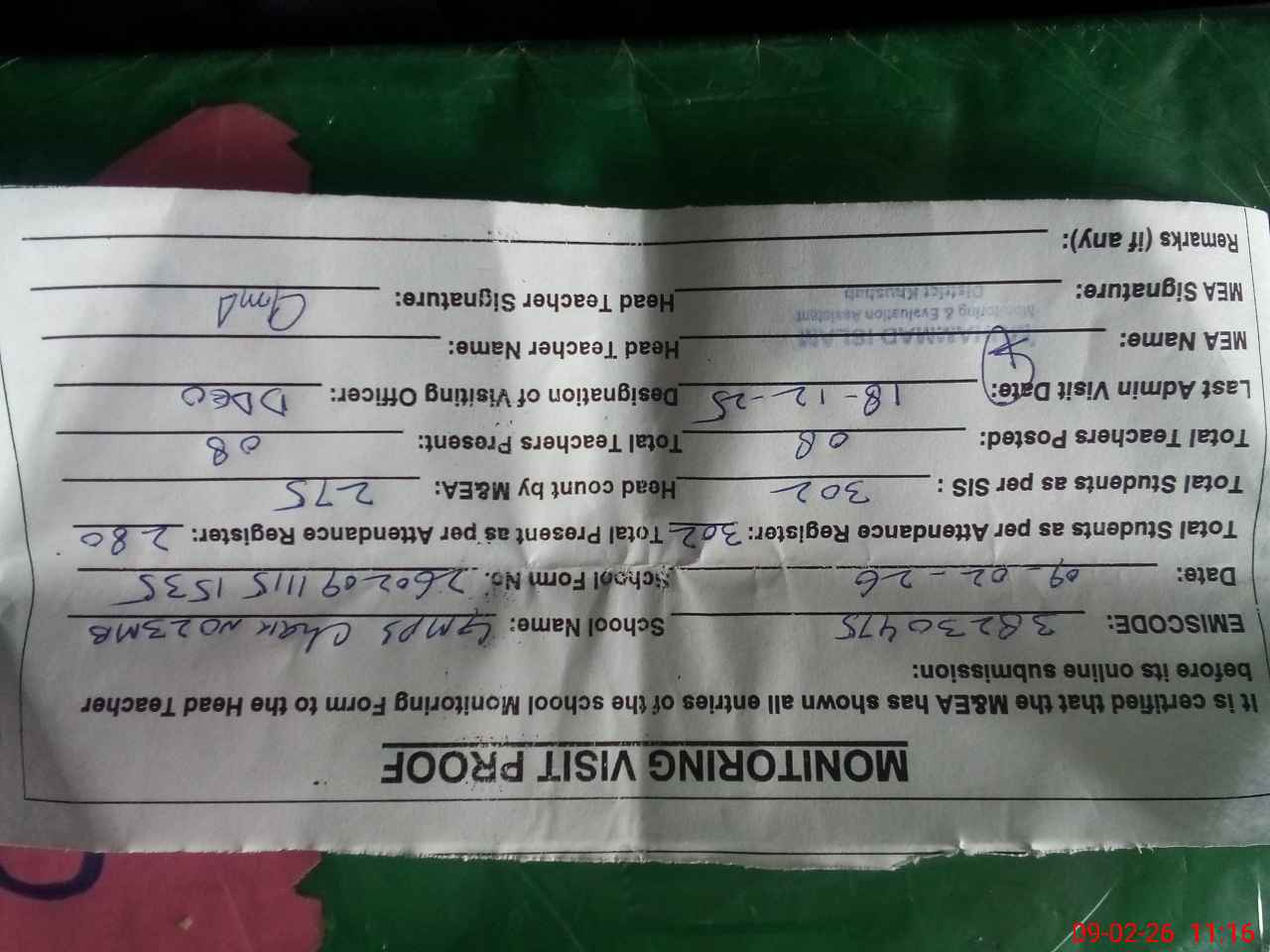 | Remarks (Use Separate Page if Required): Dy DEO visited school on 18 December 2025 students strength on sis 302 | |||||