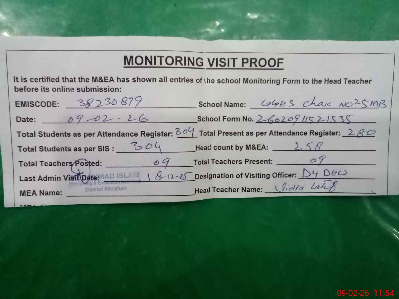 | Remarks (Use Separate Page if Required): Dy DEO visited school on 18 December 2025 students strength on sis 304 | |||||