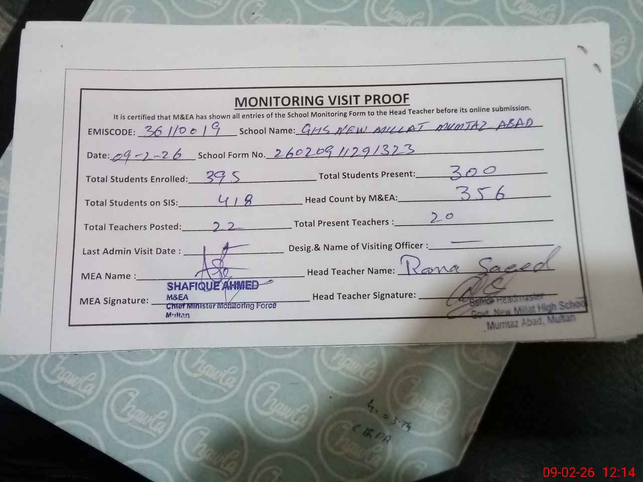 | EMIS Code: 36110019 | Name of School: GHS NEW MILLAT MUMTAZABAD MULTAN | |||