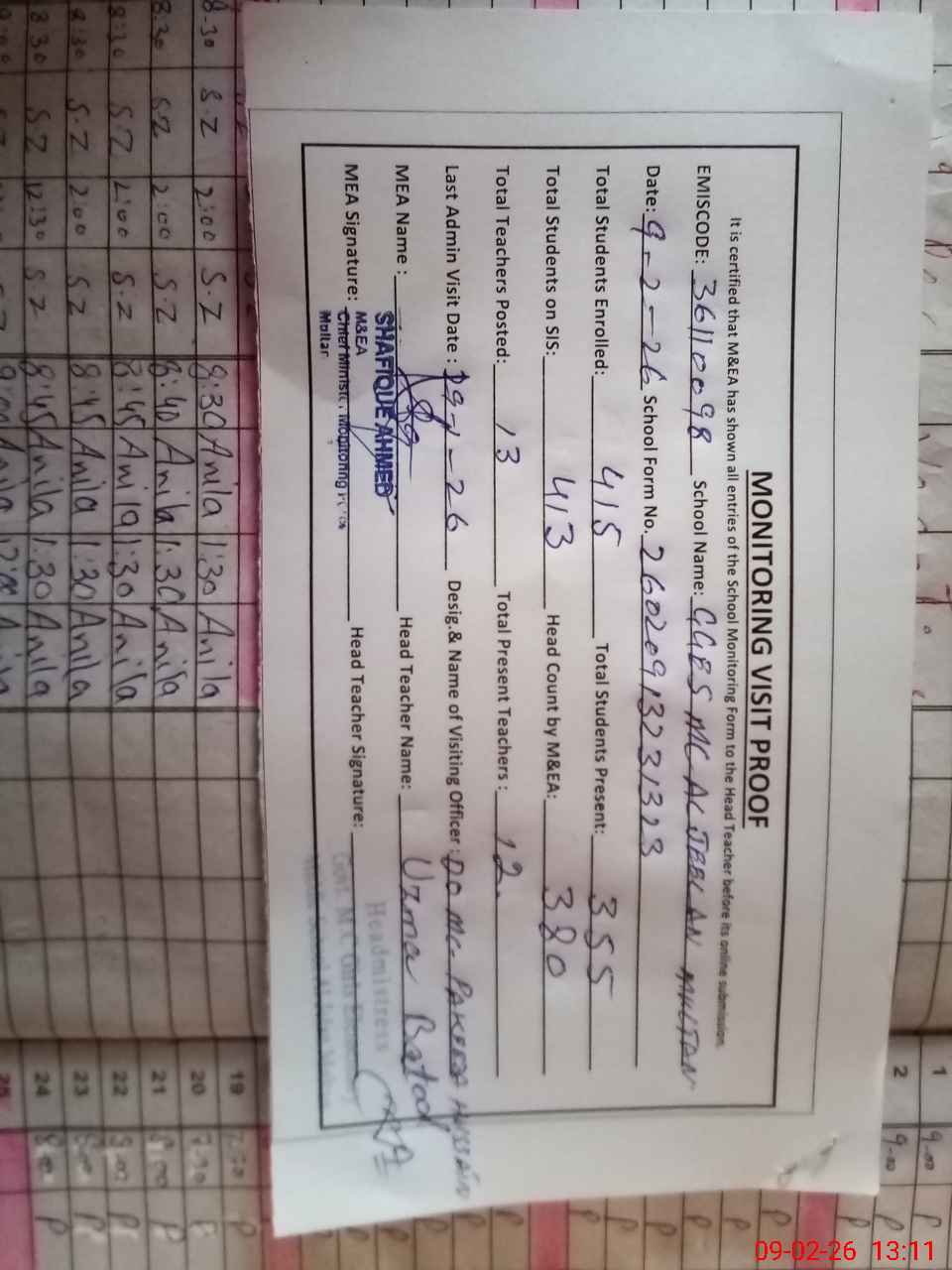 | Certified that this School was Inspected by the Undersigned MEA/DMO Today and the Information Stated Above is as Per Record. | |||||