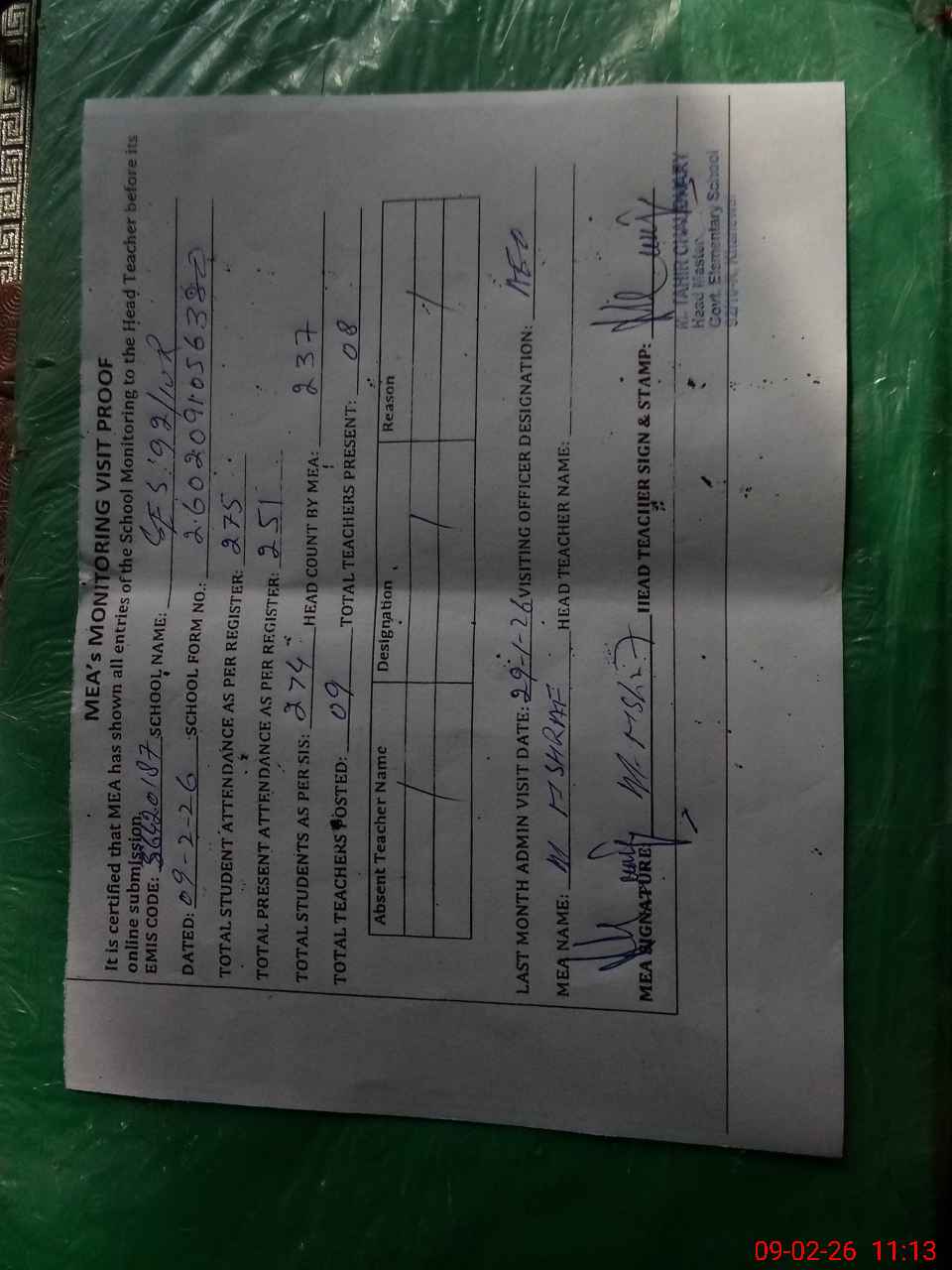 | Attendance Register | Head Teacher | MEA with School | Visit Proof |