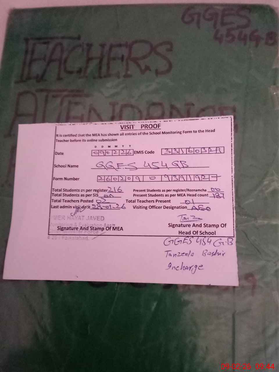 | Remarks (Use Separate Page if Required): TEACHER SHAZIA PERVEEN WAS MARKED ON LEAVE IN ATTENDANCE REGISTER BUT HER SANCTIONED LEAVE RECORD WAS NOT AVAILABLE IN THE SCHOOL AT THE TIME OF VISIT SO SHE WAS MARKED ABSENT AS PER SOP SCHOOL TAB AND STAMP WERE NOT AVAILABLE IN THE SCHOOL AT THE TIME OF VISIT NSB AND FTF RECORD WAS NOT PROVIDED AT THE TIME OF VISIT | |||||