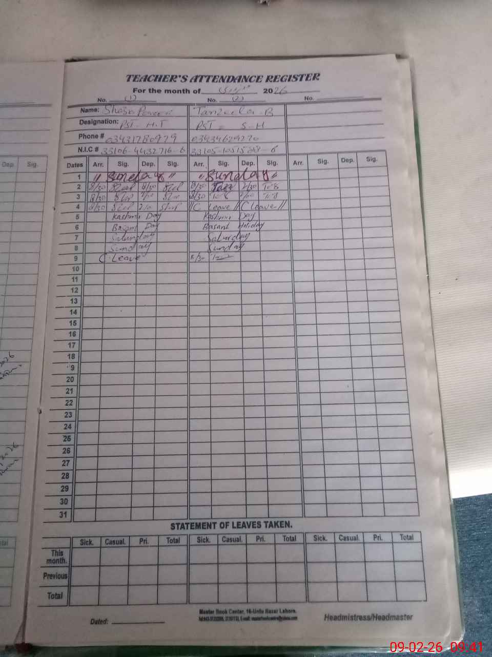 | CNIC | Full Name | Designation | R/C | Absence During Last Calender Month |