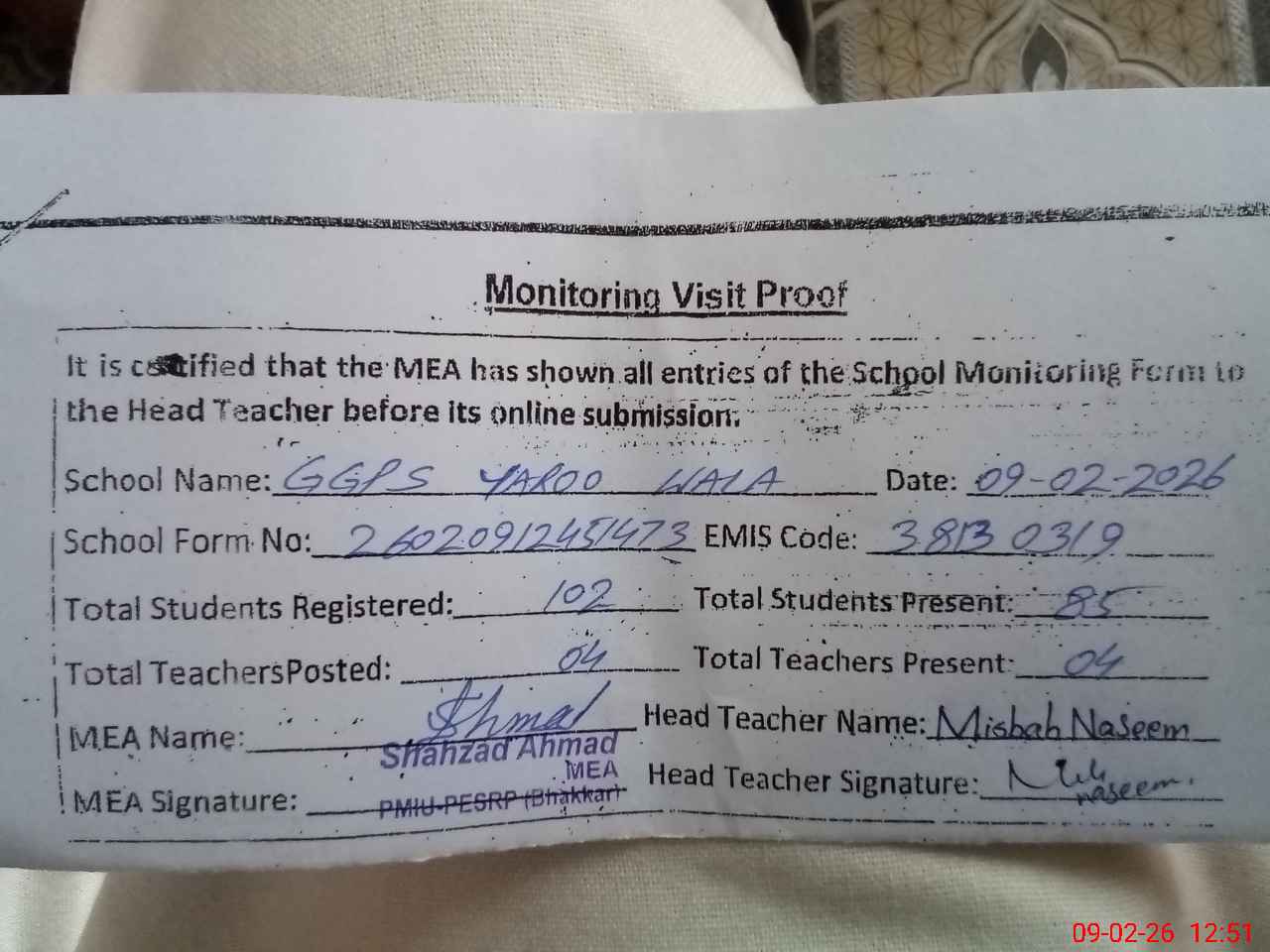 | EMIS Code: 38130319 | Name of School: GGPS YAROO WALA | |||