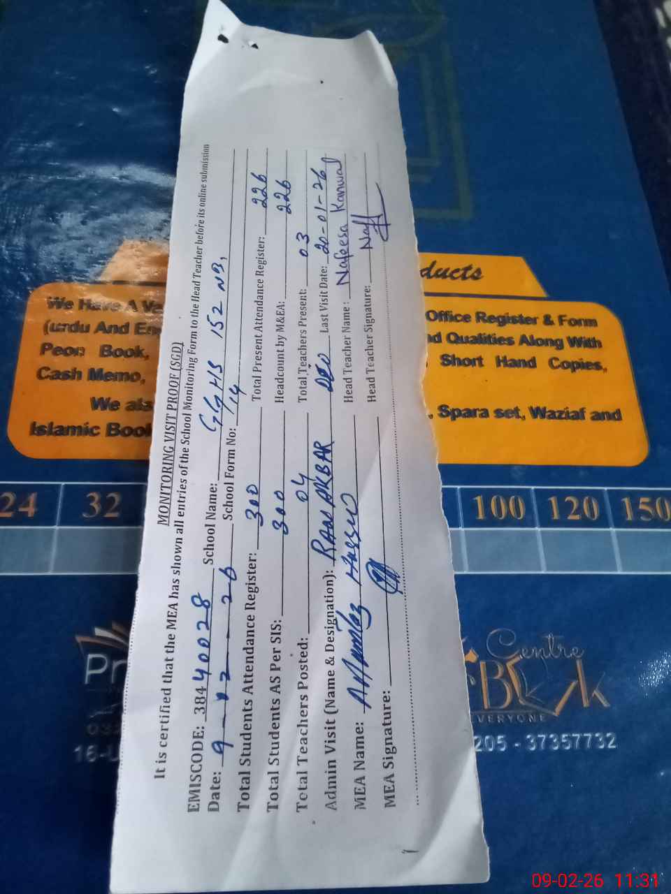 | Attendance Register | Head Teacher | MEA with School | Visit Proof |