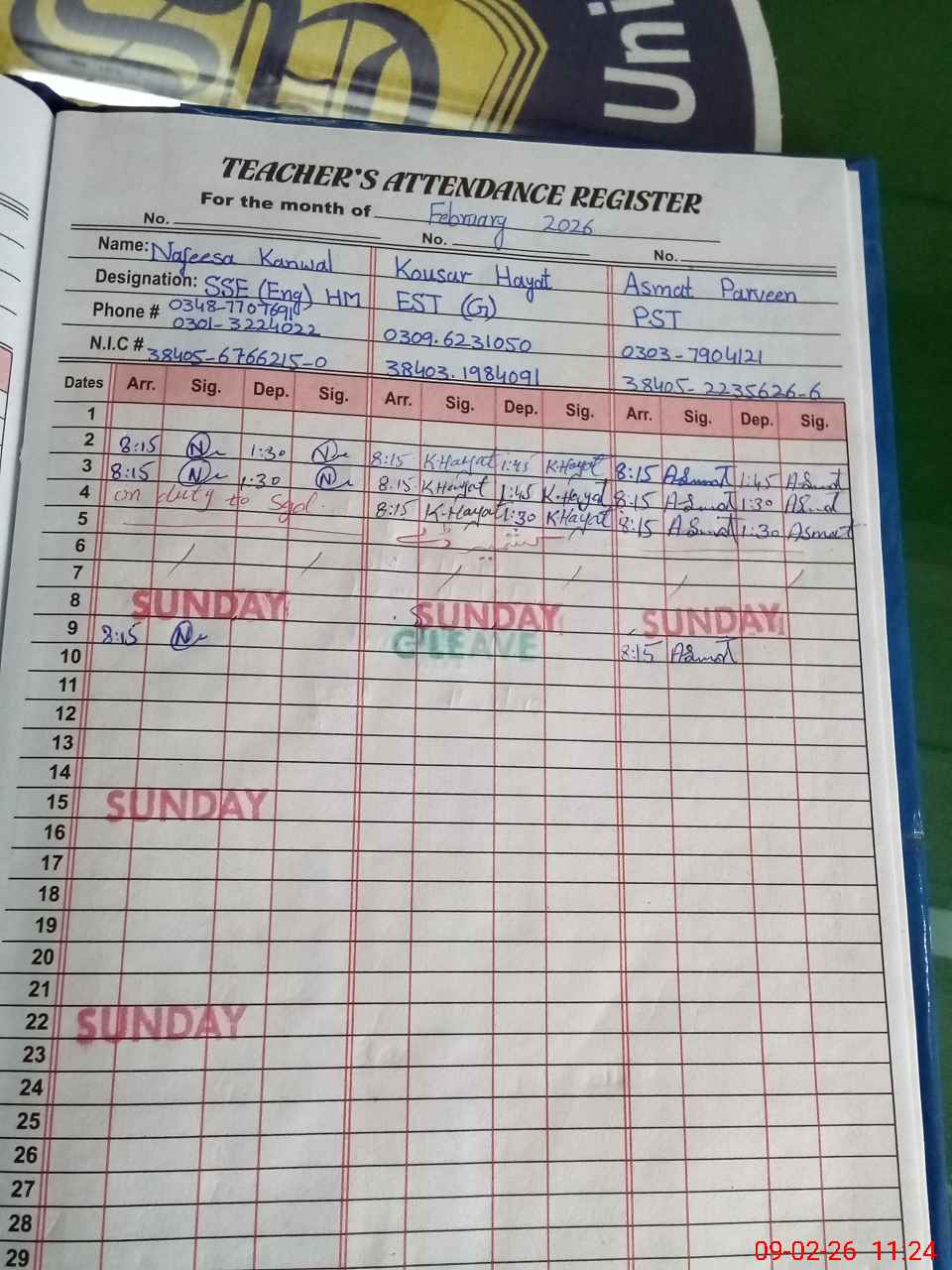 | CNIC | Full Name | Designation | R/C | Absence During Last Calender Month |