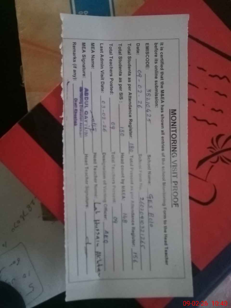 | Attendance Register | Head Teacher | MEA with School | Visit Proof |