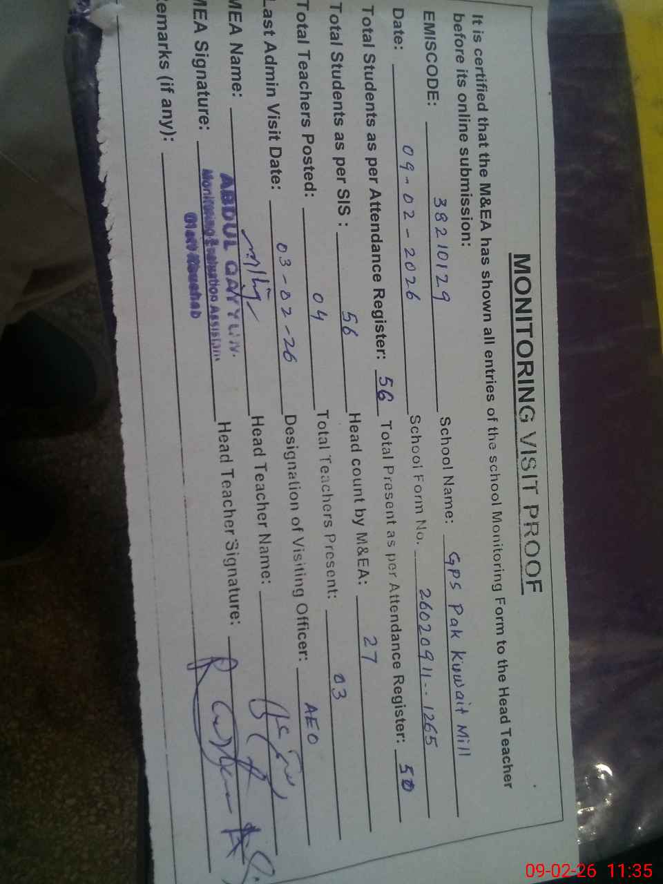 | EMIS Code: 38210129 | Name of School: GPS PAK KUWAIT MILLS KHUSHAB | |||