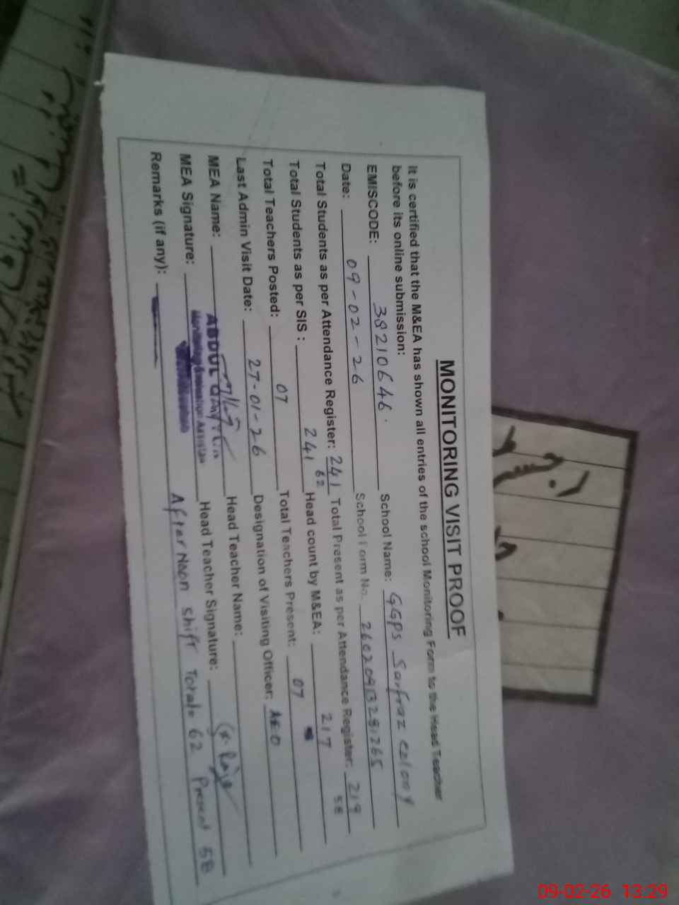 | Attendance Register | Head Teacher | MEA with School | Visit Proof |