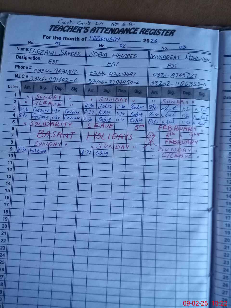 | CNIC | Full Name | Designation | R/C | Absence During Last Calender Month |