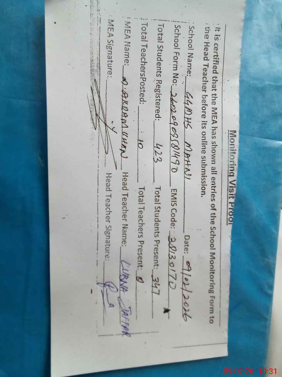 | Certified that this School was Inspected by the Undersigned MEA/DMO Today and the Information Stated Above is as Per Record. | |||||