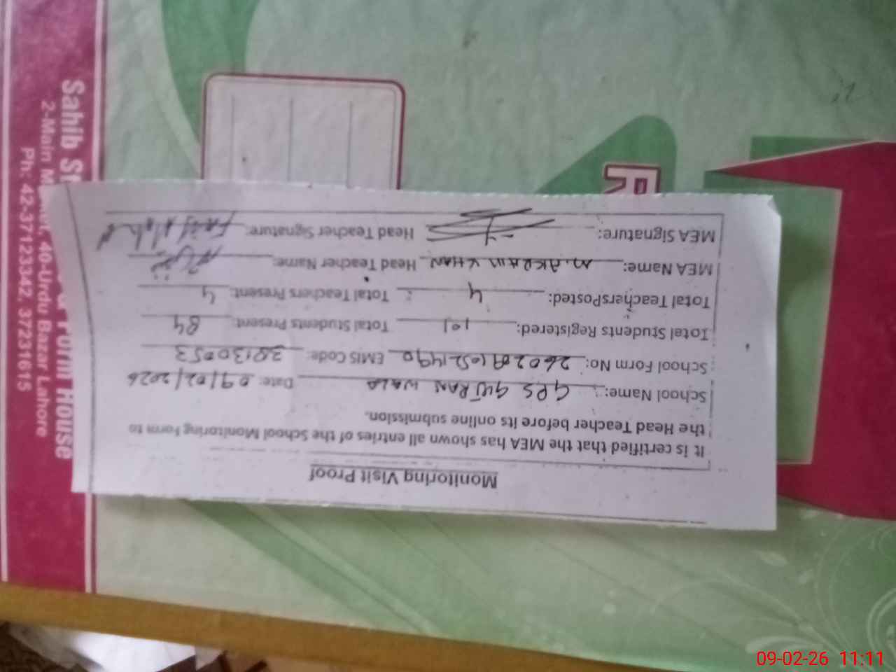 | Name: FA**** MU**** Designation: (School Headmaster's/Headmistress's) PTC/JV Phone/Cell Number: 03**** |