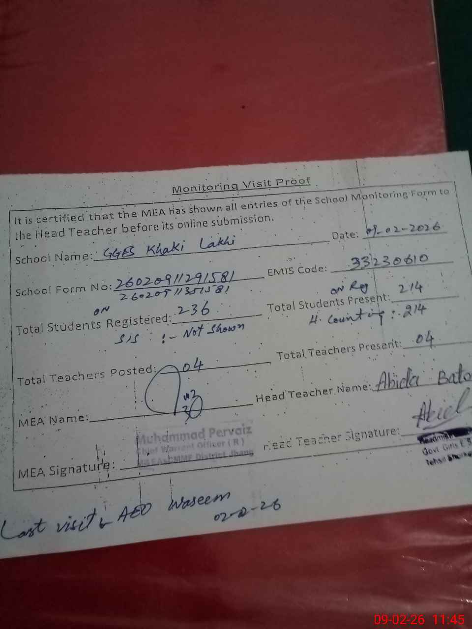 | Attendance Register | Head Teacher | MEA with School | Visit Proof |