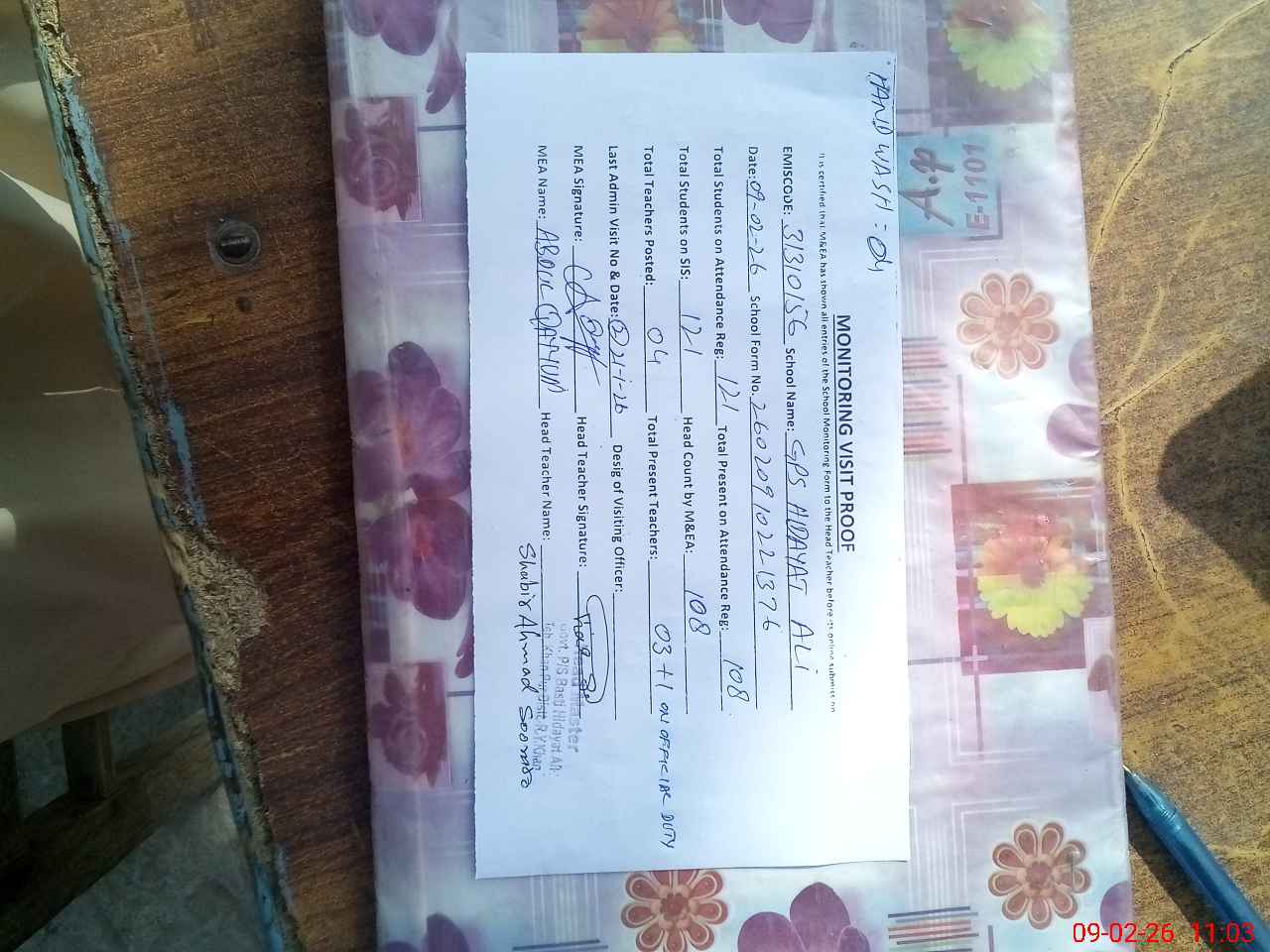 | Attendance Register | Head Teacher | MEA with School | Visit Proof |
