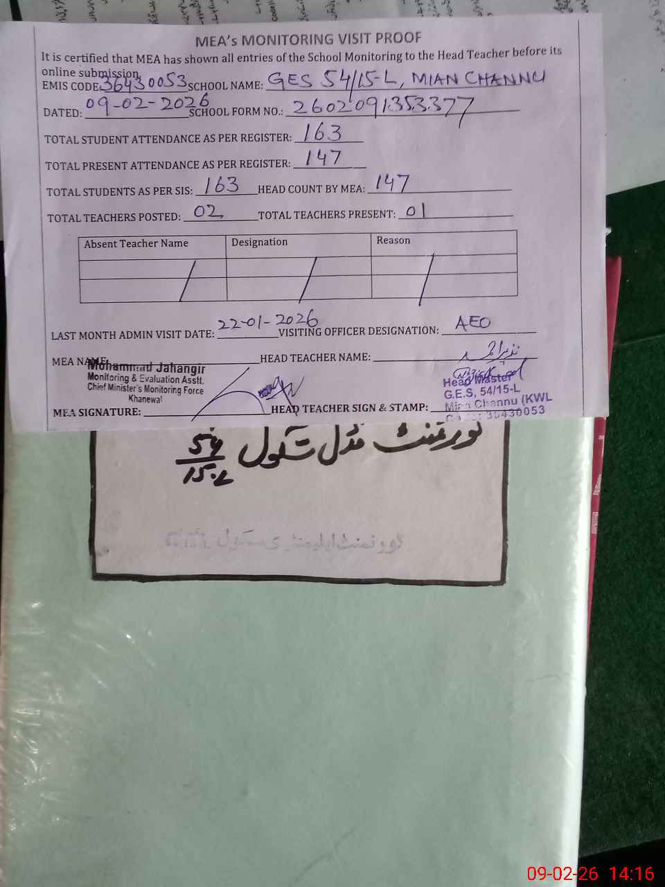 | EMIS Code: 36430053 | Name of School: GES 54/15-L, MIAN CHANNU | |||