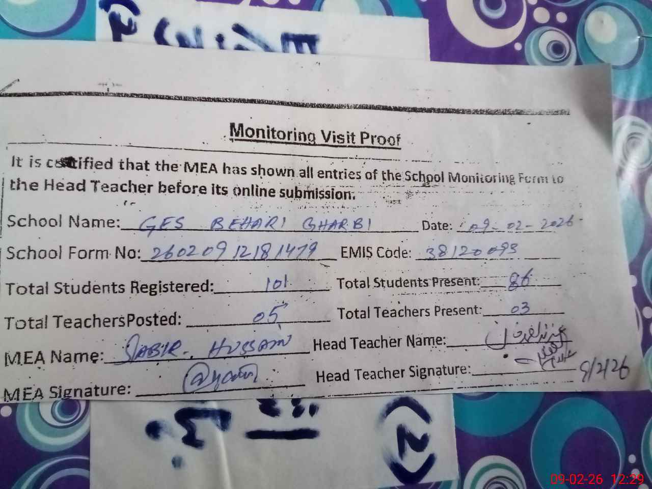 | Attendance Register | Head Teacher | MEA with School | Visit Proof |