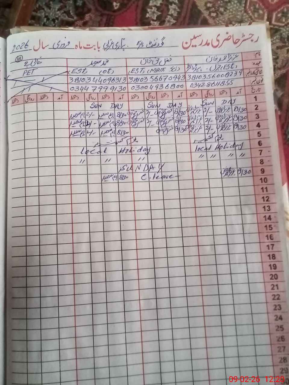 | CNIC | Full Name | Designation | R/C | Absence During Last Calender Month |