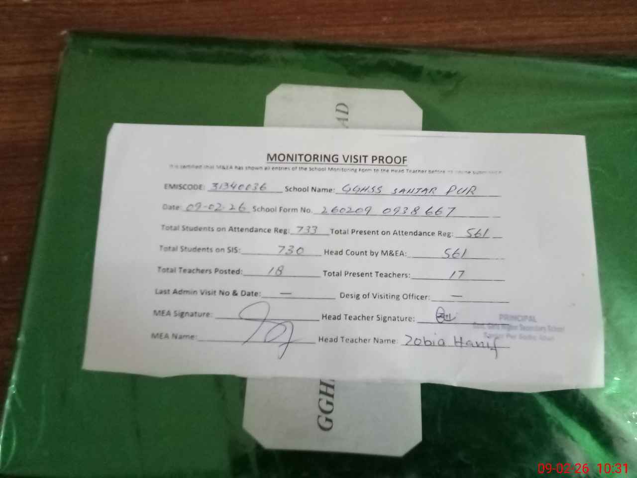 | Attendance Register | Head Teacher | MEA with School | Visit Proof |