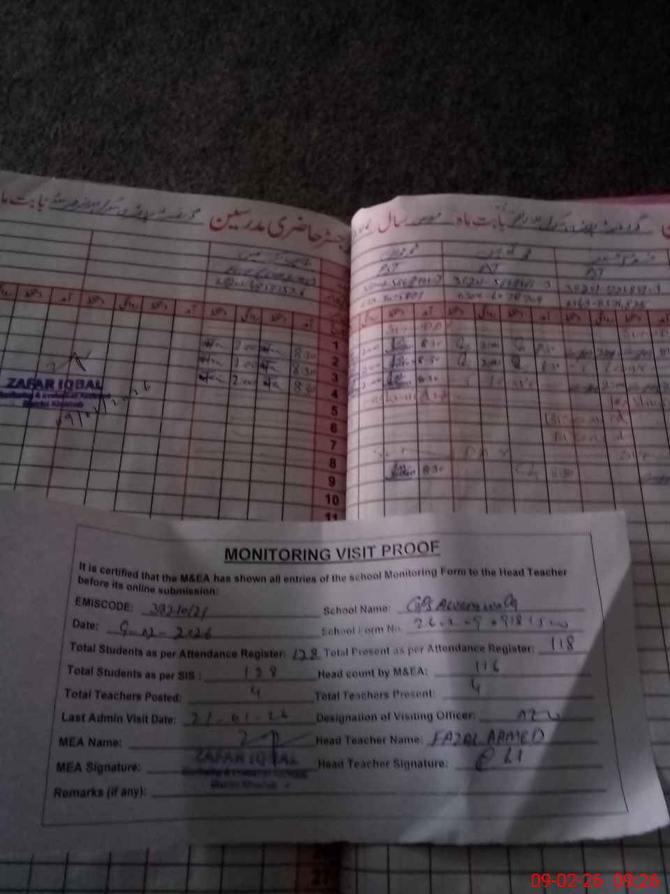 | Attendance Register | Head Teacher | MEA with School | Visit Proof |