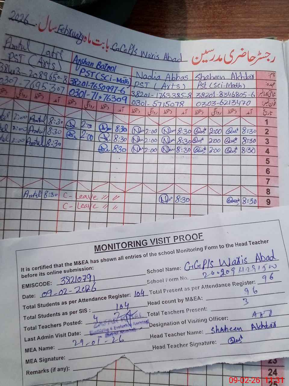 | Attendance Register | Head Teacher | MEA with School | Visit Proof |