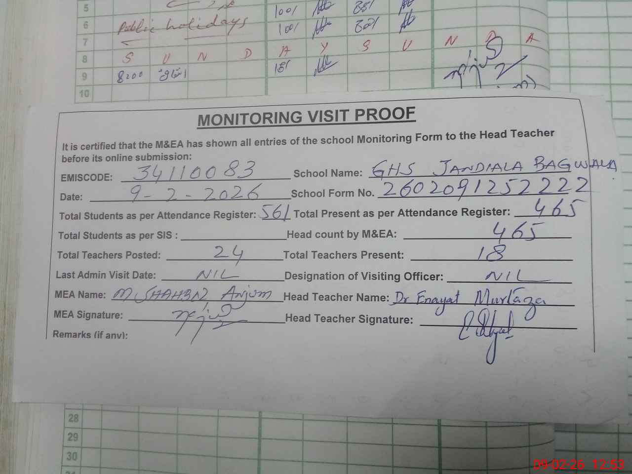 | Attendance Register | Head Teacher | MEA with School | Visit Proof |