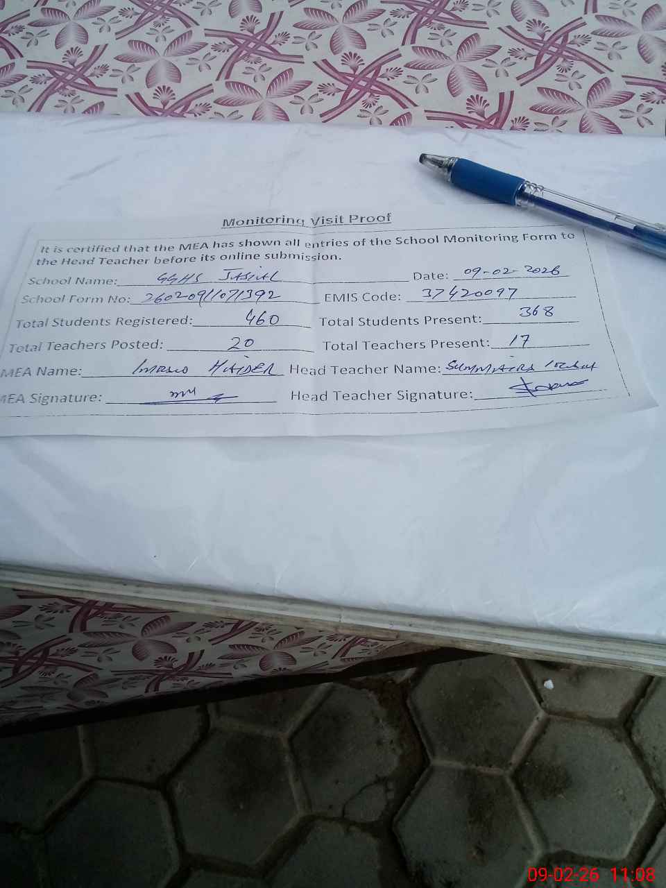 | Attendance Register | Head Teacher | MEA with School | Visit Proof |