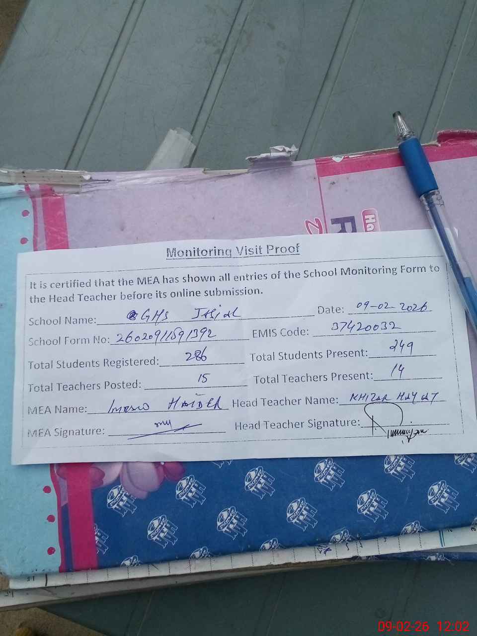 | Attendance Register | Head Teacher | MEA with School | Visit Proof |