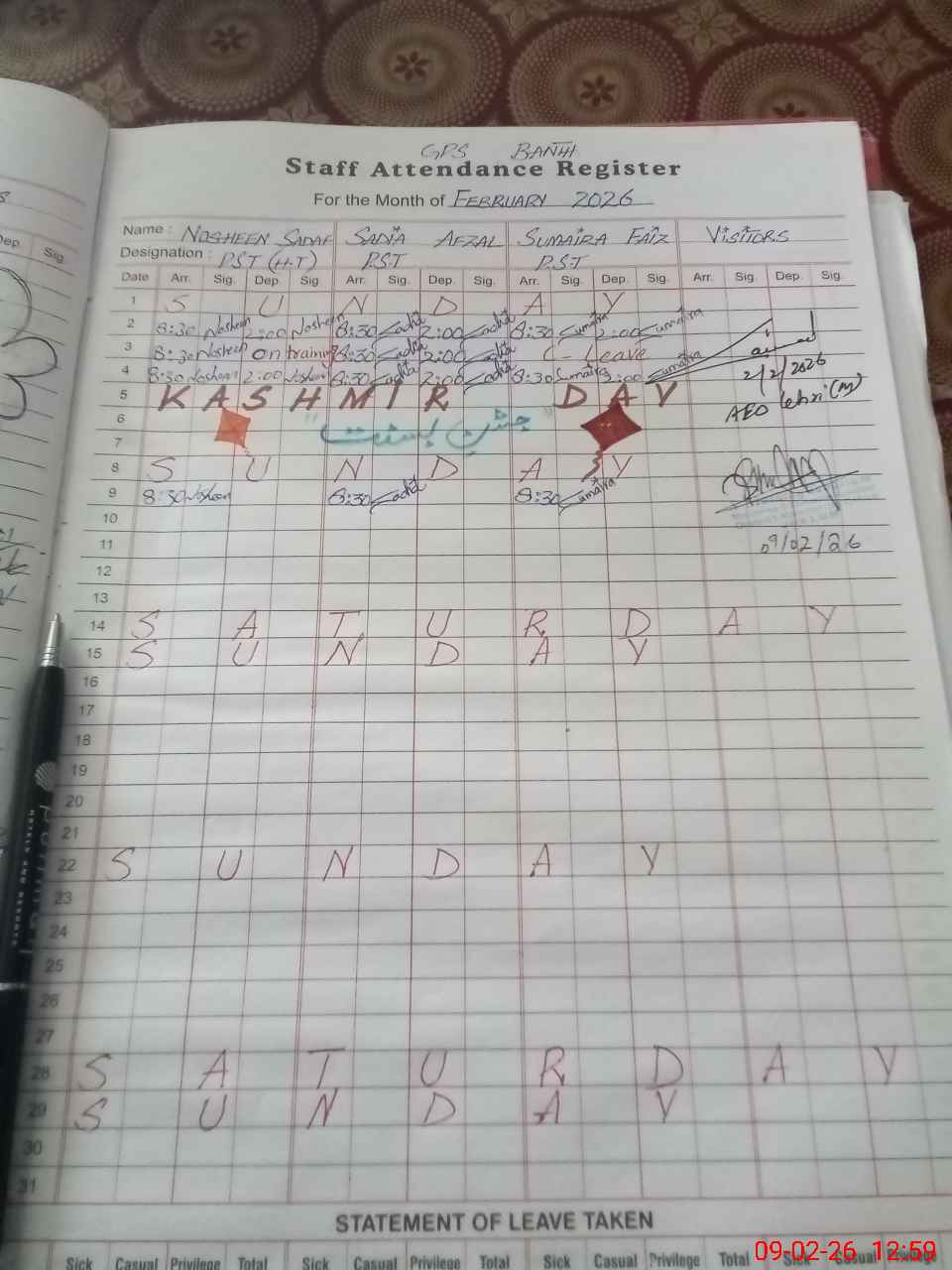 | Total no. of Classrooms: 2 No. of Classrooms Used for Teaching: 2 No. of Classrooms Storing Old Furniture, FTBs, etc: 0Comments if Any: Nadeem Afzal son of Muhammad Afzal student of Class V is retained in class IV. His name is in class V attendance. |