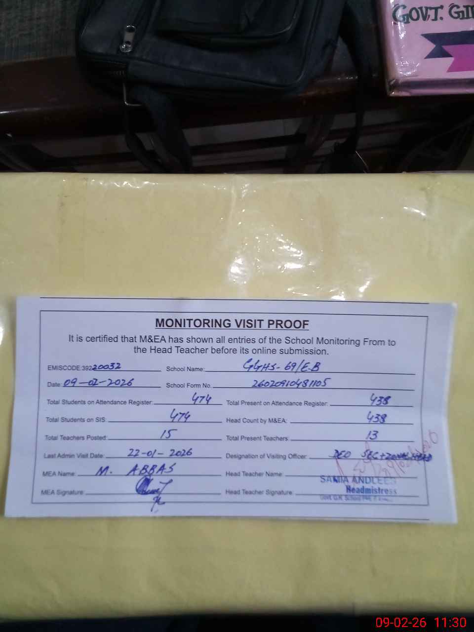 | EMIS Code: 39220032 | Name of School: GGHS 69 EB ARIF WALA | |||