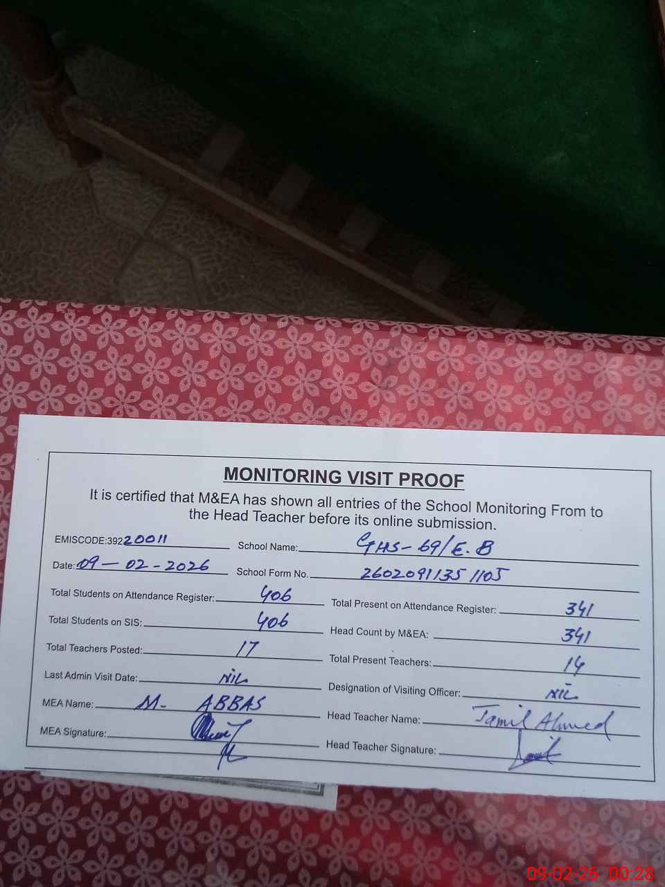 | EMIS Code: 39220011 | Name of School: GHS 69/EB ARIF WALA | |||