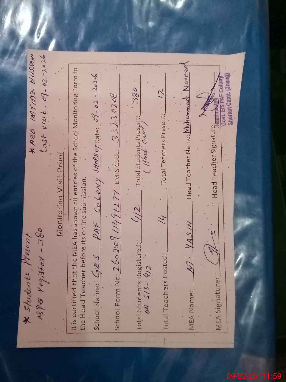 | Attendance Register | Head Teacher | MEA with School | Visit Proof |