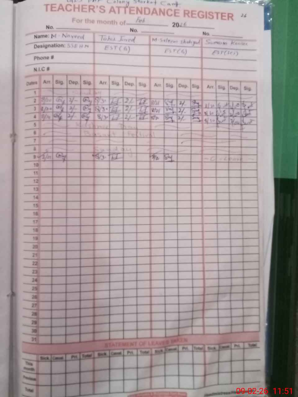 | CNIC | Full Name | Designation | R/C | Absence During Last Calender Month |