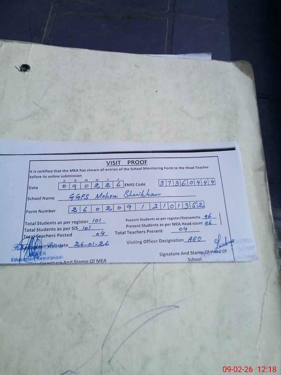 | Attendance Register | Head Teacher | MEA with School | Visit Proof |
