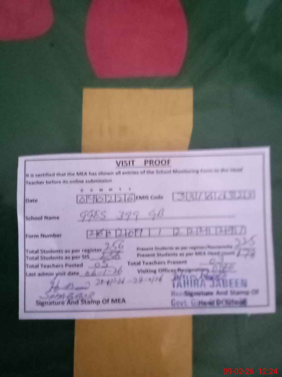 | Attendance Register | Head Teacher | MEA with School | Visit Proof |
