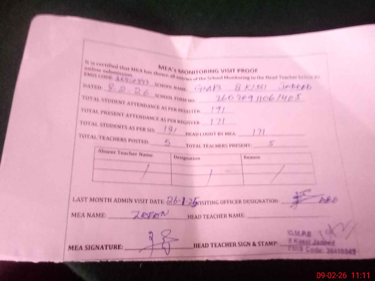 | EMIS Code: 36410343 | Name of School: GMPS 8-KASSI JADEED, KABIRWALA | |||