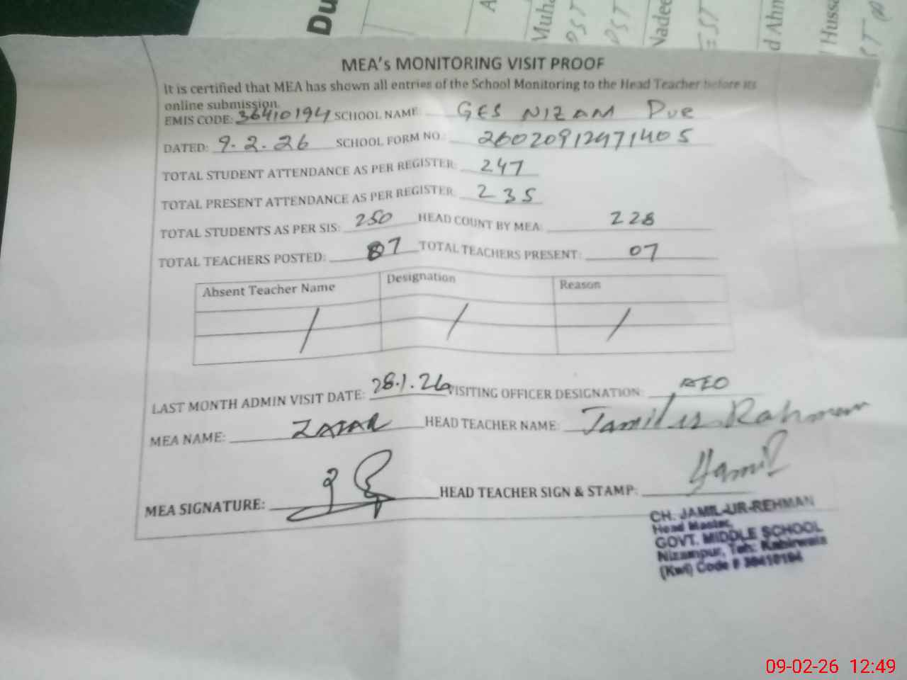 | EMIS Code: 36410194 | Name of School: GES NIZAM PUR, KABIRWALA | |||
