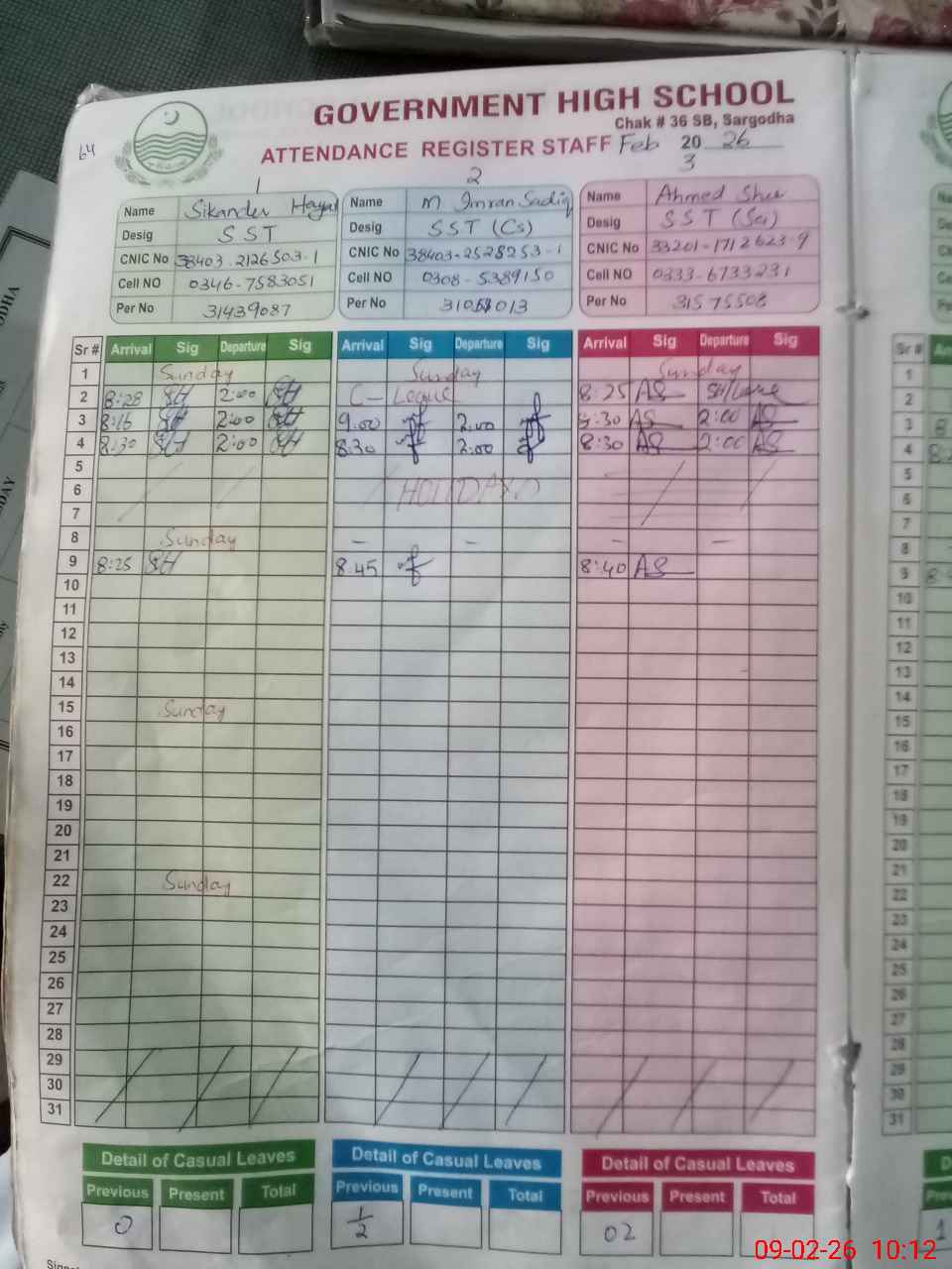 | CNIC | Full Name | Designation | R/C | Absence during last cal. month |