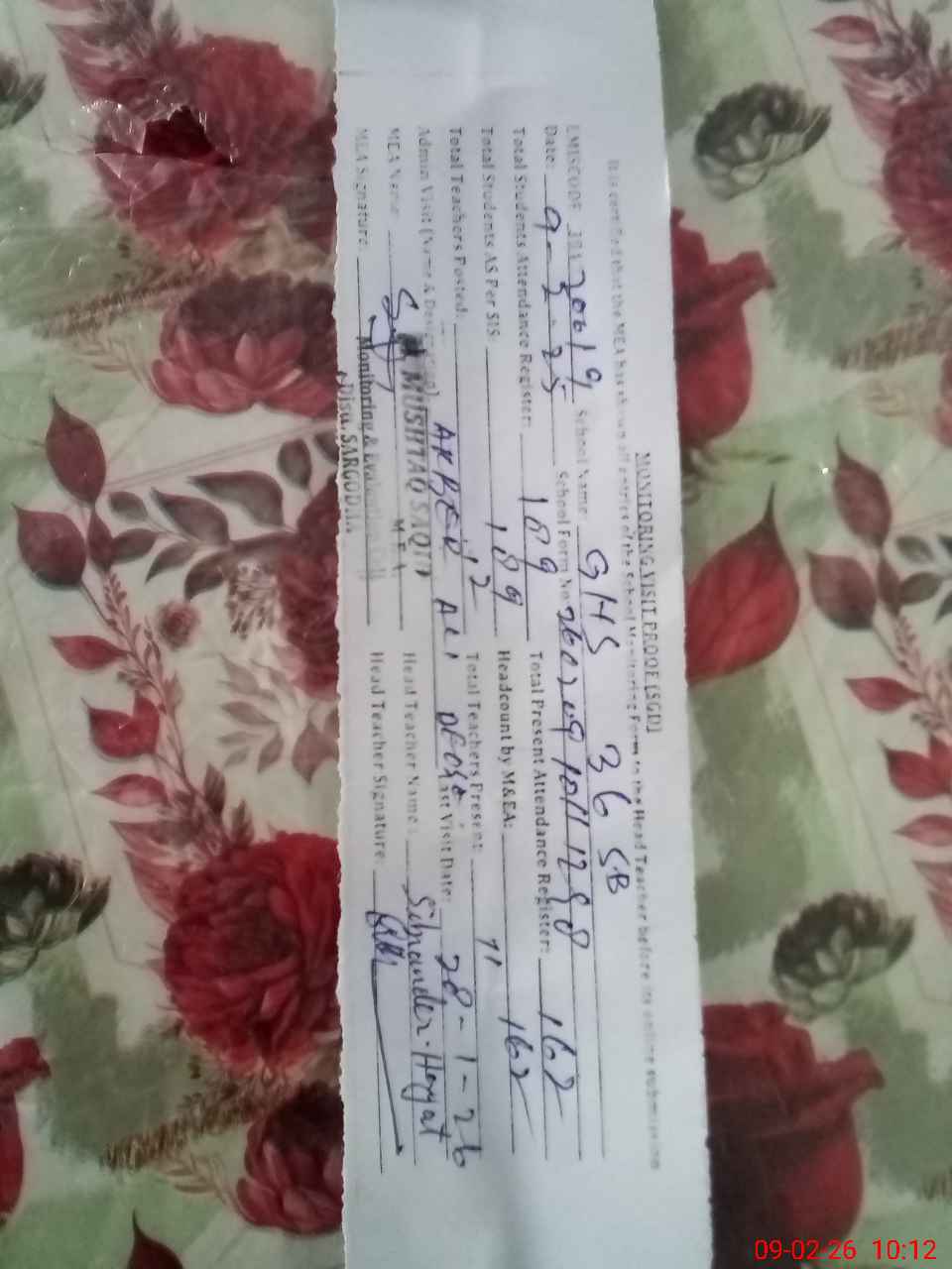 | Attendance Register | Head Teacher | MEA with School | Visit Proof |