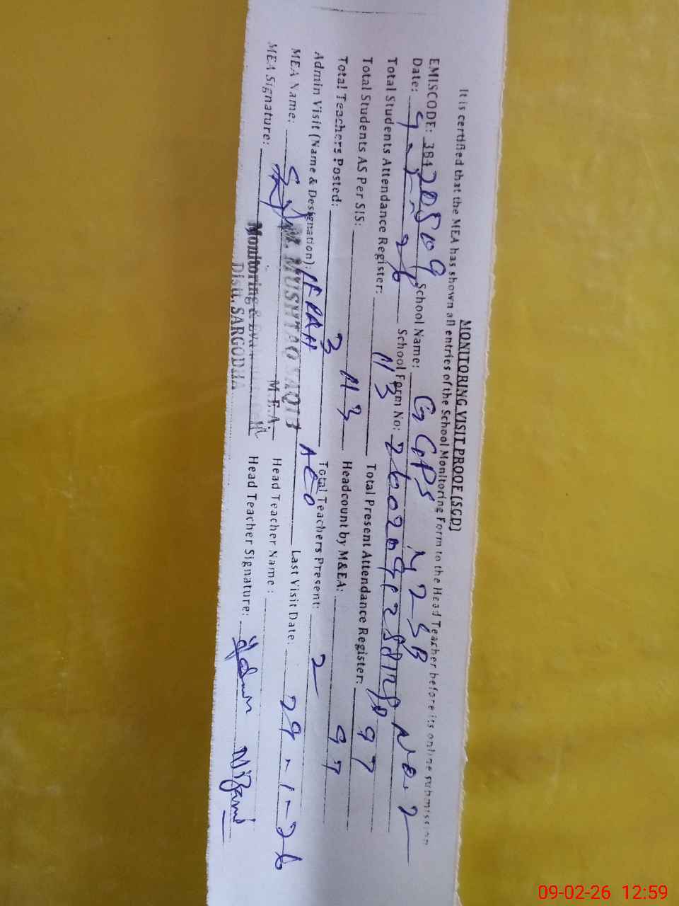 | Attendance Register | Head Teacher | MEA with School | Visit Proof |