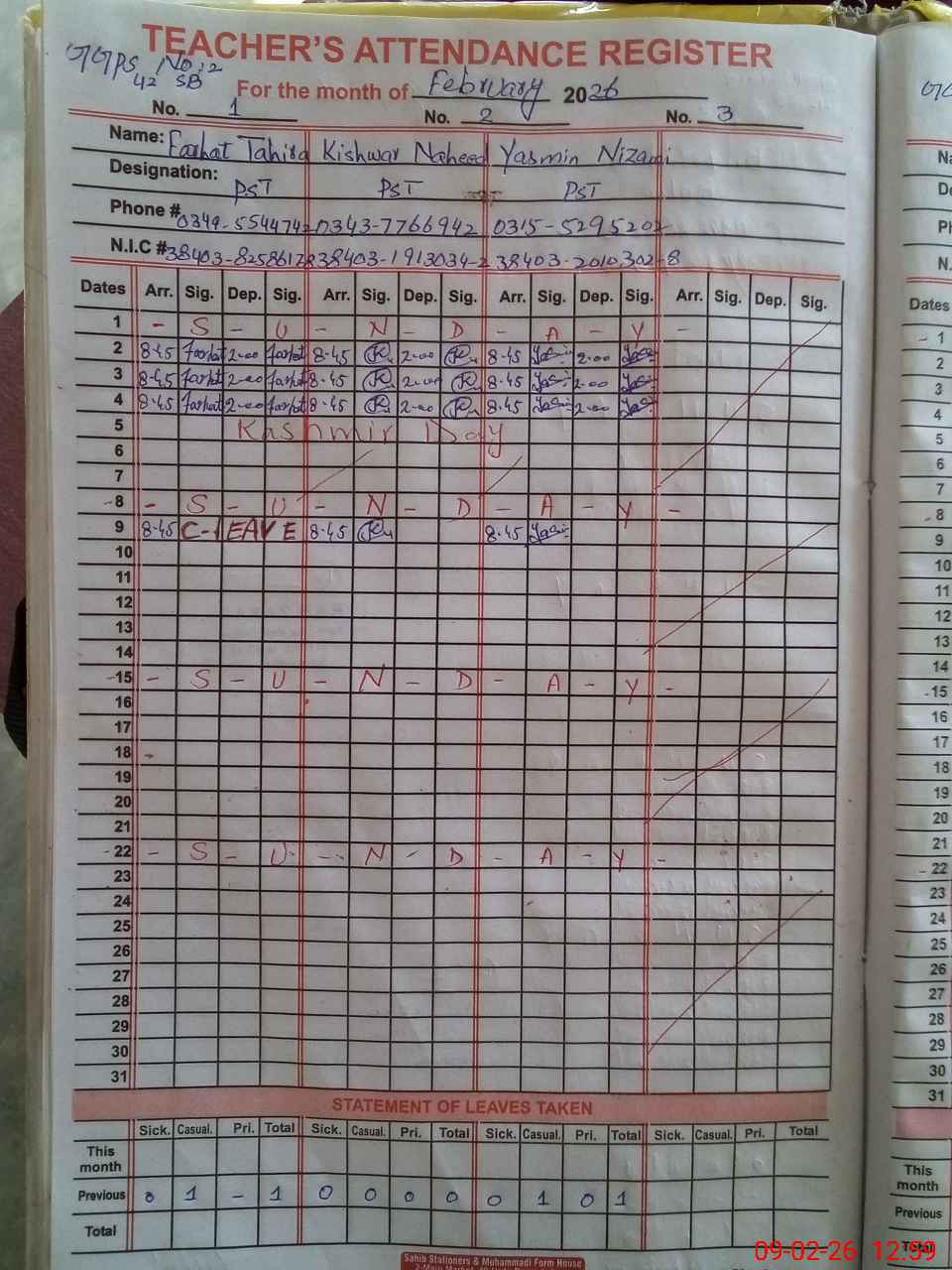 | CNIC | Full Name | Designation | R/C | Absence During Last Calender Month |
